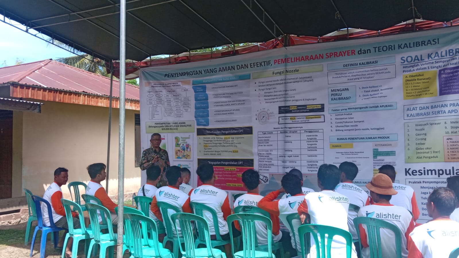 Peserta dibagi 3 kelompok masing-masing 30 orang untuk mengikuti secara bergilir materi dari Dinas Pertanian, Dinas Kesehatan dan ALISHTER dan dilanjutkan diskusi. Materi pelatihan yang terakhir adalah praktek penyemprotan yang baik dan benar serta kalibrasi hand sprayer.