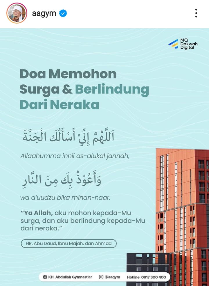 “Mari kita amalkan dan istiqomahkan doa ini, agar Alloh Subhanahu Wa Ta’ala dapat mendengar dan mengabulkan apa yang kita minta. Aamiin Ya Robbal ‘alamin,” ajak @aagym.