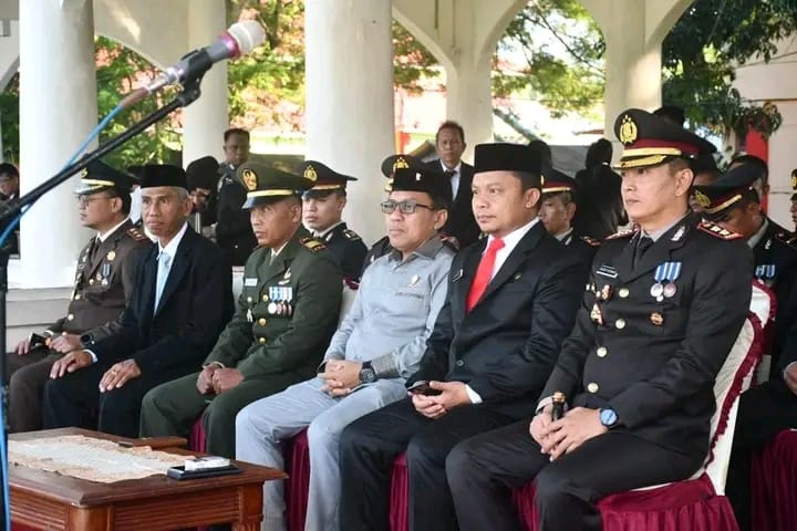 HIMPUN.ID – Penjabat Sekretaris Daerah Supandra Nur, menghadiri upacara peringatan Hari Ulang Tahun (HUT) Bhayangkara ke – 77 yang berlangsung di Lapangan Alun – alun, Tilamuta, Sabtu 1 Juli 2023.