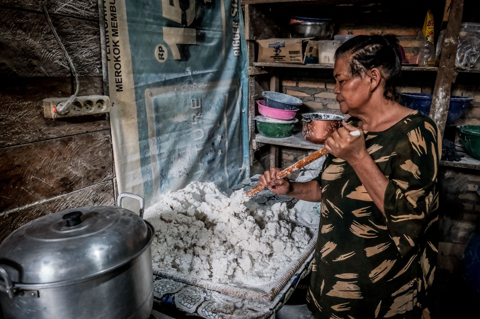 Setiap hari, iya bersama anak bungsu dan keluarganya bangun pagi untuk memasak ombus-ombus di dapur yang berada di belakang tokonya. Mulai dari menumbuk beras hingga jadi tepung, mengaduk adonan, hingga mengukus.