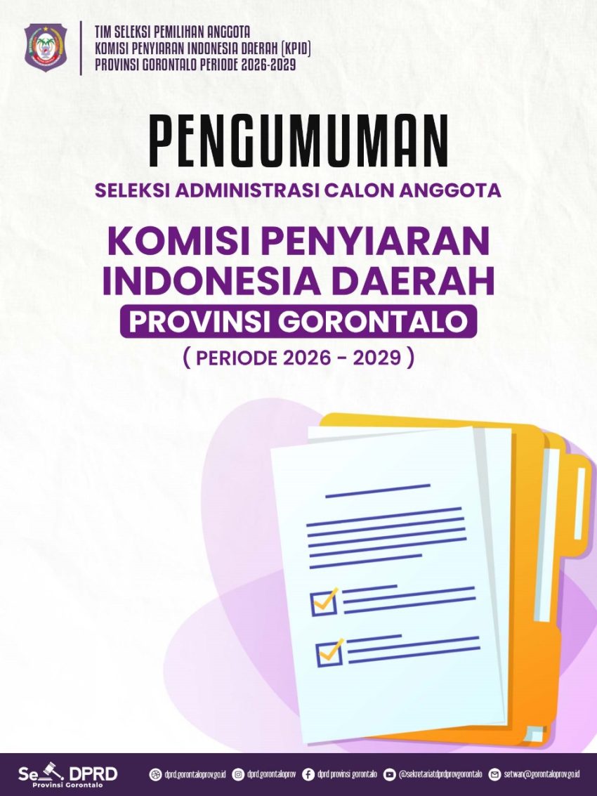 HIMPUN.ID – Pengumuman seleksi administrasi calon anggota Komisi Penyiaran Indonesia Daerah (KPID) Provinsi Gorontalo periode 2026–2029, secara resmi diluncurkan oleh Tim Seleksi Pemilihan Anggota KPID Provinsi Gorontalo.
