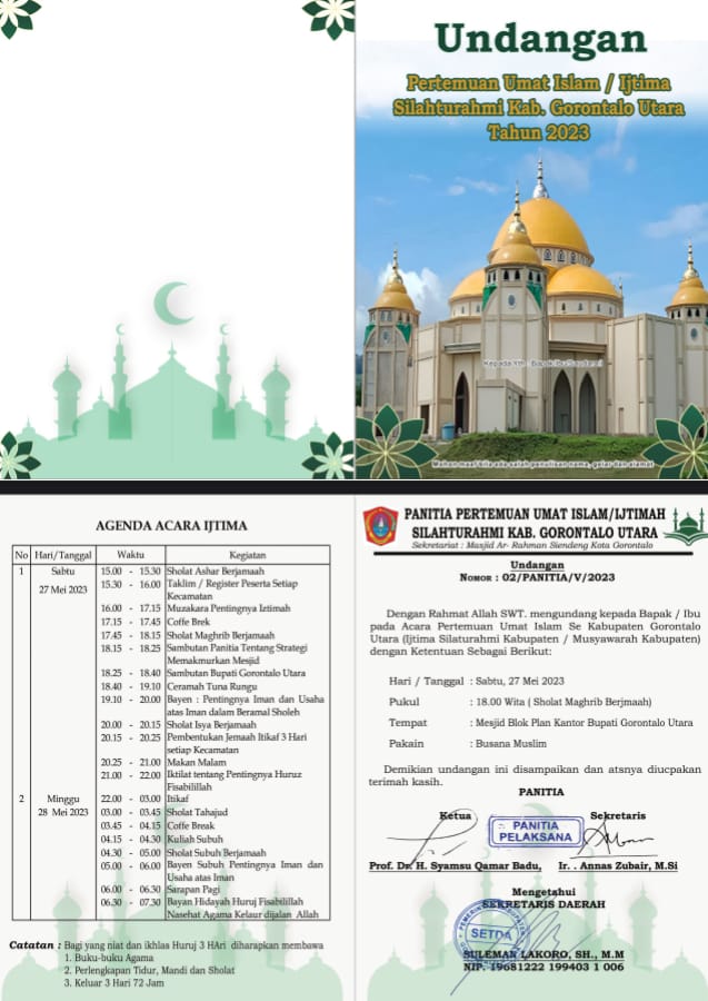 Undangan pertemuan Umat Islam/Ijtima Silaturahmi se Kabupaten Gorontalo Utara tersebut sebagaimana tercantum dalam nomor surat 02/Panitia/V/2023 yang ditanda tangani oleh Ketua panitia, Prof. Dr. H. Syamsu Qamar Badu, mengetahui Sekretaris Daerah Gorontalo Utara, Suleman Lakoro.